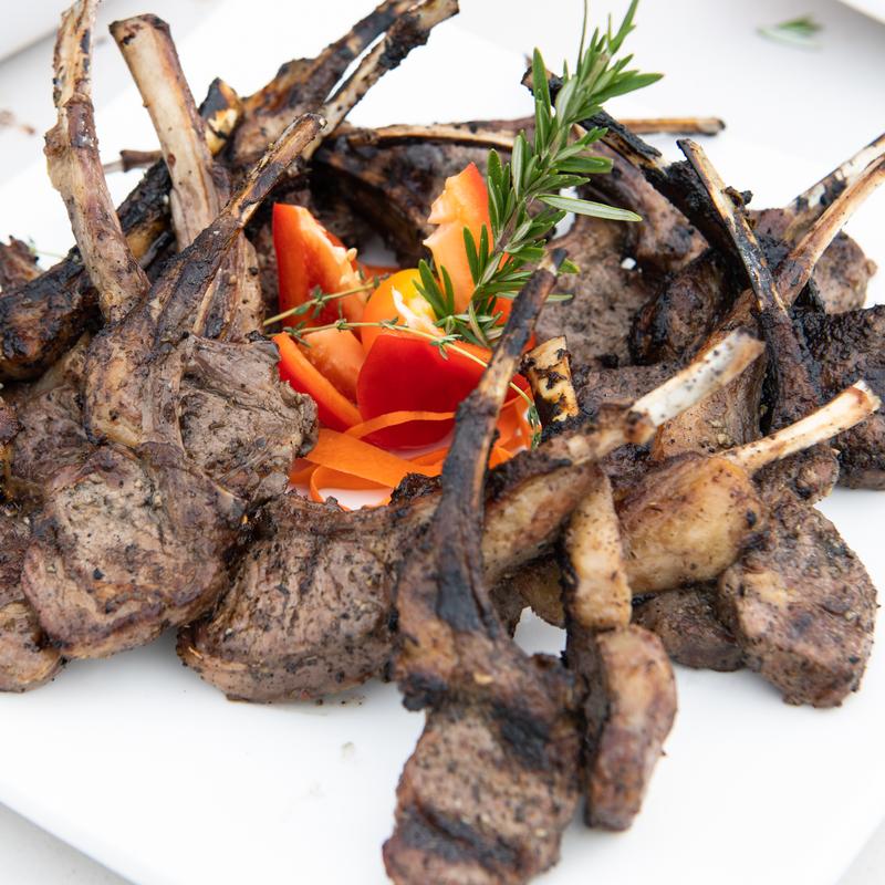 - (4) Lamb Chops Seared To Medium & Served With Crumbled Feta, Spinach, Grape Tomatoes & Olives