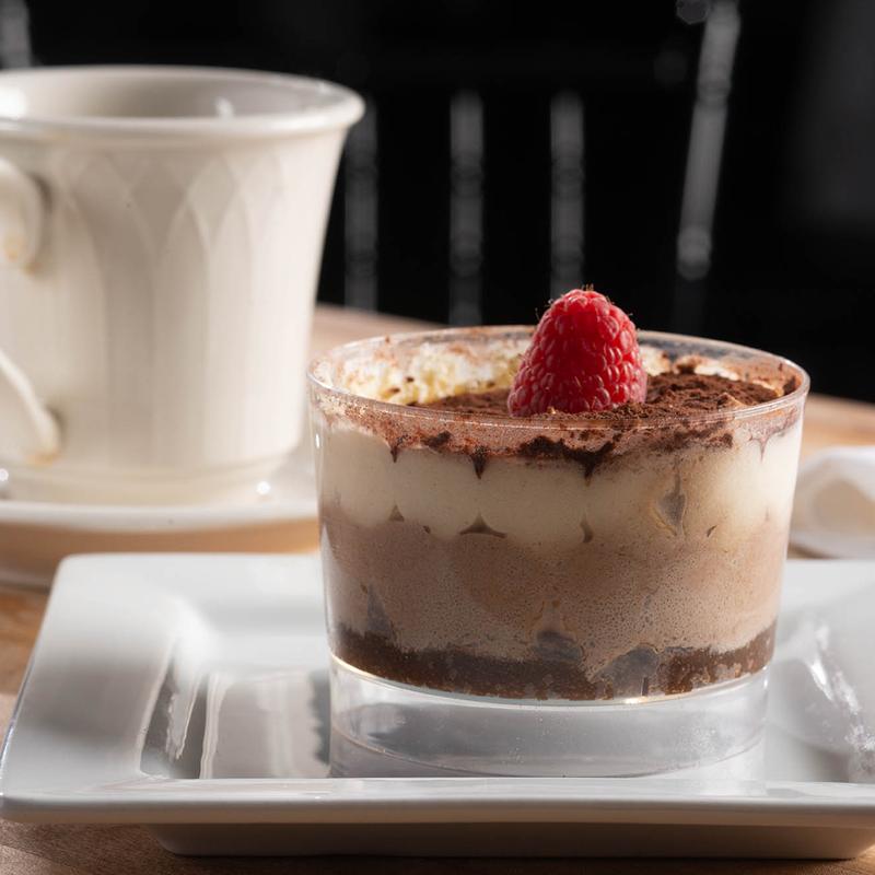 Traditional tiramisu made with espresso soaked ladyfingers & mascarpone cream, dusted w/ cocoa powder